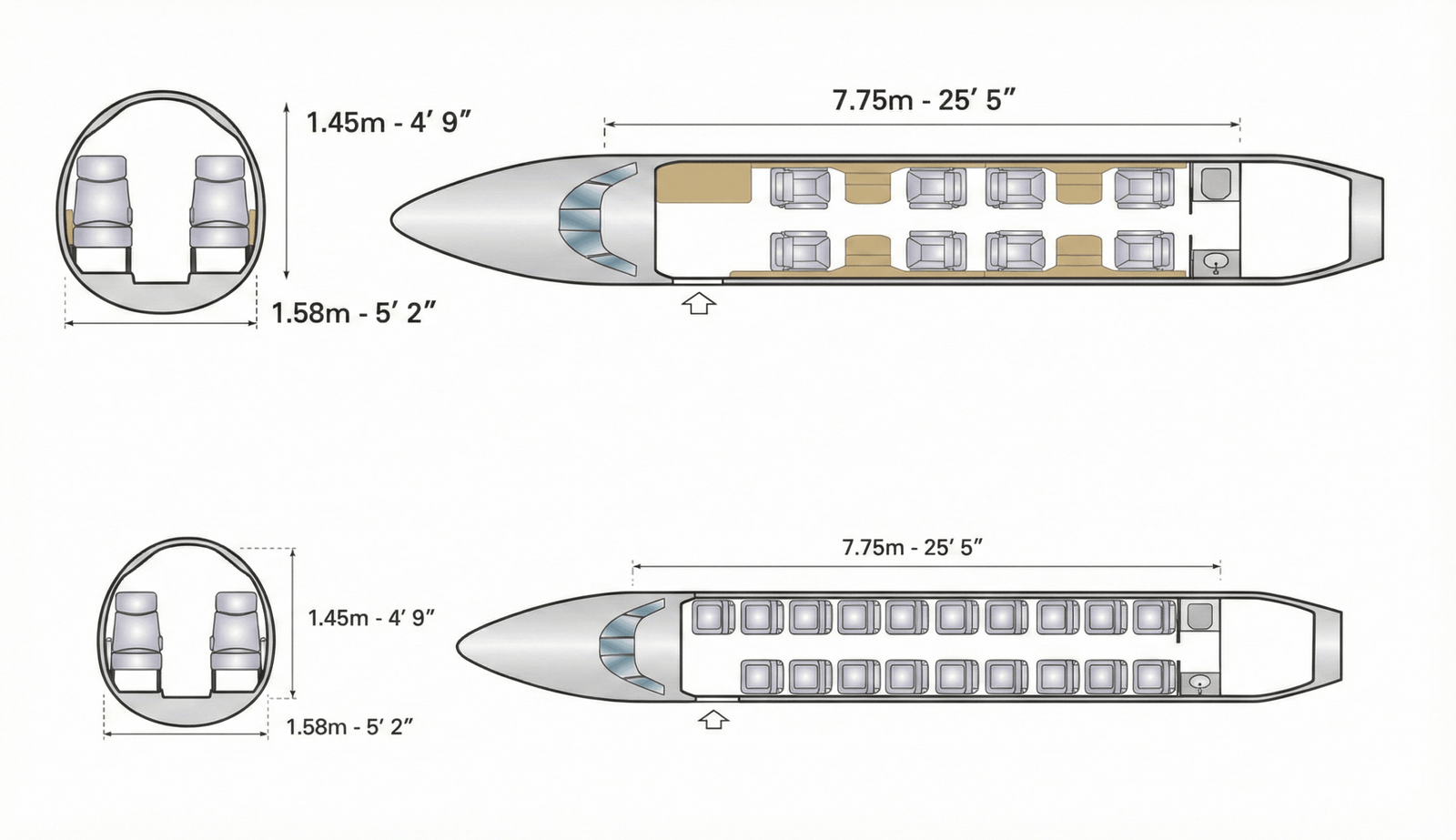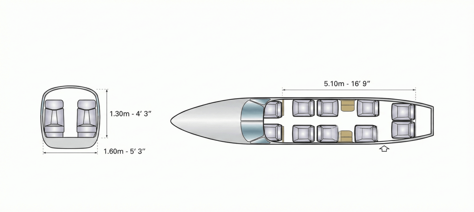 Pueden operar en aeropuertos grandes y pistas cortas o de difícil acceso, adaptándose a cualquier destino. El servicio incluye atención personalizada a bordo.
